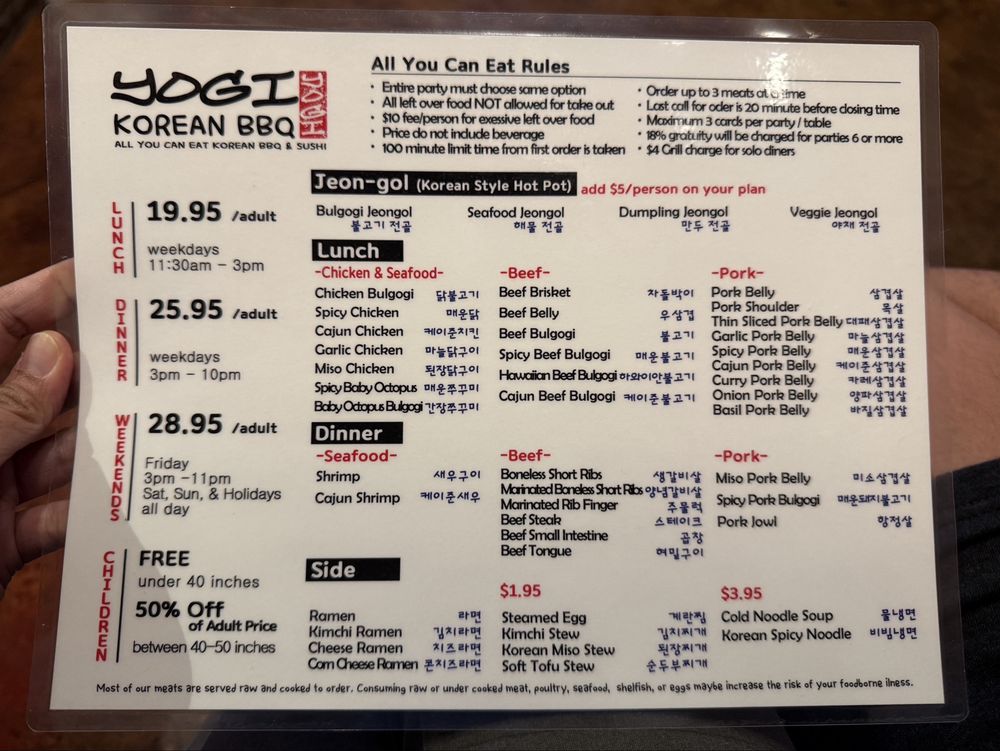 Yogi Korean BBQ offers a trendy dining experience in Stockton, CA, where you can enjoy authentic Korean barbeque dishes. With options like Beef Brisket Combo, Beef Bulgogi Combo, Chicken Bulgogi Combo, Marinated Short Ribs Combo, Spicy Pork Bulgogi Combo, and Thin Sliced Pork Belly Combo, there is something for everyone. The menu also includes delicious entrées such as Beef Bulgogi, Beef Rib Soup, Beef Short Rib Soup, Boneless Short Ribs, and Chicken Bulgogi. Don't miss out on their Dosirak boxes, including Beef Bulgogi Box, Boneless Short Ribs Box, Chicken Box, Short Ribs Box, Spicy Chicken Box, Spicy Pork Bulgogi Box, and Spicy Thin Sliced Pork Box. Yogi Korean BBQ's attentive service, outdoor seating, and dogs allowed policy make it a great spot for groups to enjoy a flavorful meal.